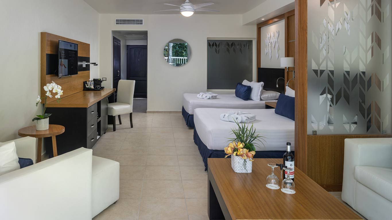 Las espaciosas y elegantes Junior Suites en Ocean Blue & Sand son ideales para viajar en familia. Equipadas con sala de estar y terraza con vista al jardín. Capacidad máxima 5 personas (4 adultos).
