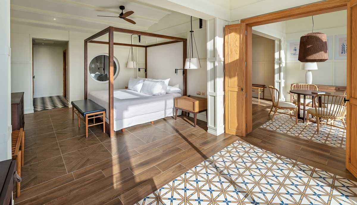 Amplia y cómoda habitación de inspiración colonial frente al mar. Cuenta con área de dormitorio, sala de estar independiente con sofá cama y una terraza. Capacidad máxima para 2 personas.