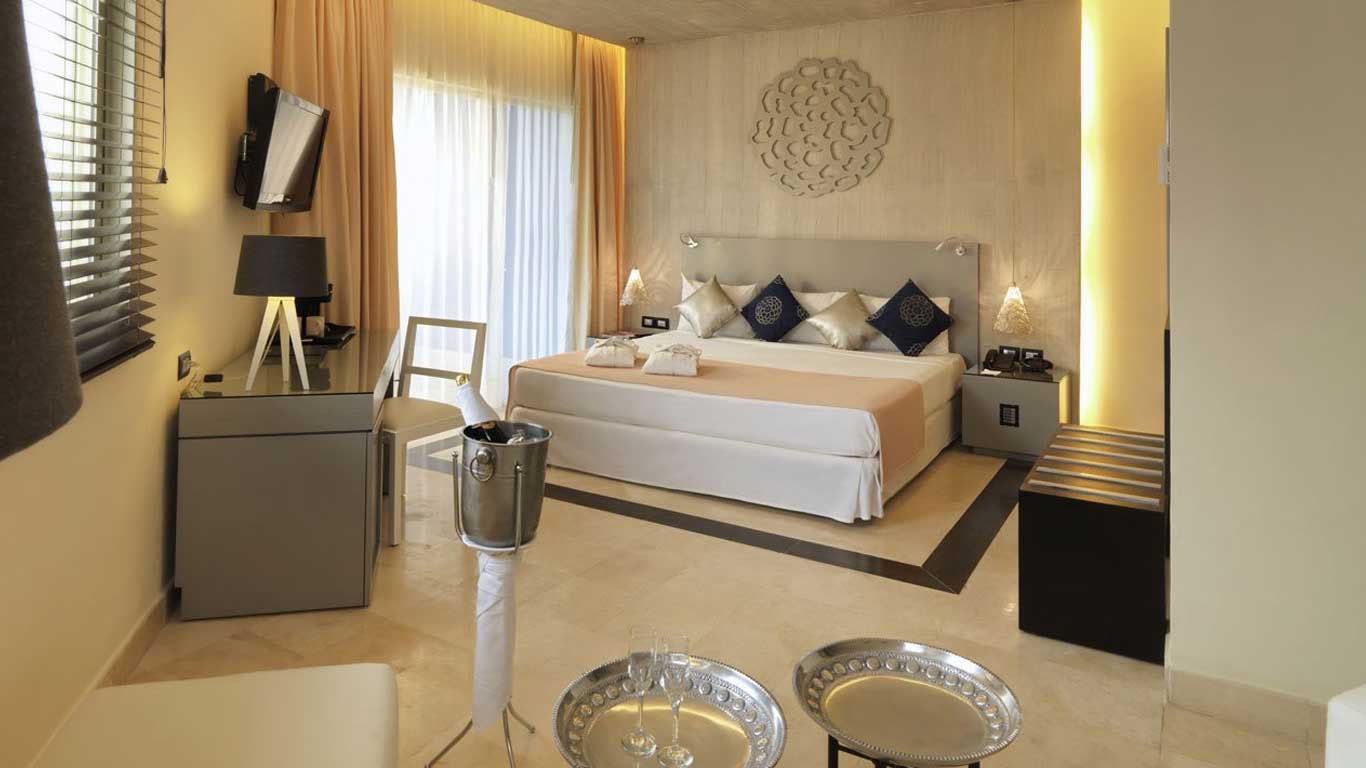 La Suite Junior Privilege Honeymoon en Ocean Maya Royale es la mejor opción para descansar y celebrar en pareja. Ofrece la comodidad y exclusividad de los servicios y amenities Privilege, así como una hermosa vista al jardín. Está equipada con una amplia sala de estar con sofá y una terraza amueblada con jacuzzi. Capacidad máxima 2 adultos.