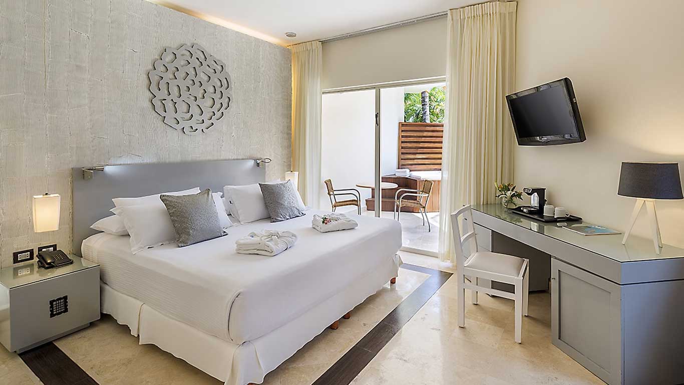 La acogedora y elegante Maya Deluxe Privilege Honeymoon en Ocean Maya Royale está diseñada especialmente para relajarse en pareja. Además de proporcionar amenities y servicios Privilege, tiene un balcón con una relajante vista al jardín. Capacidad máxima 2 adultos.